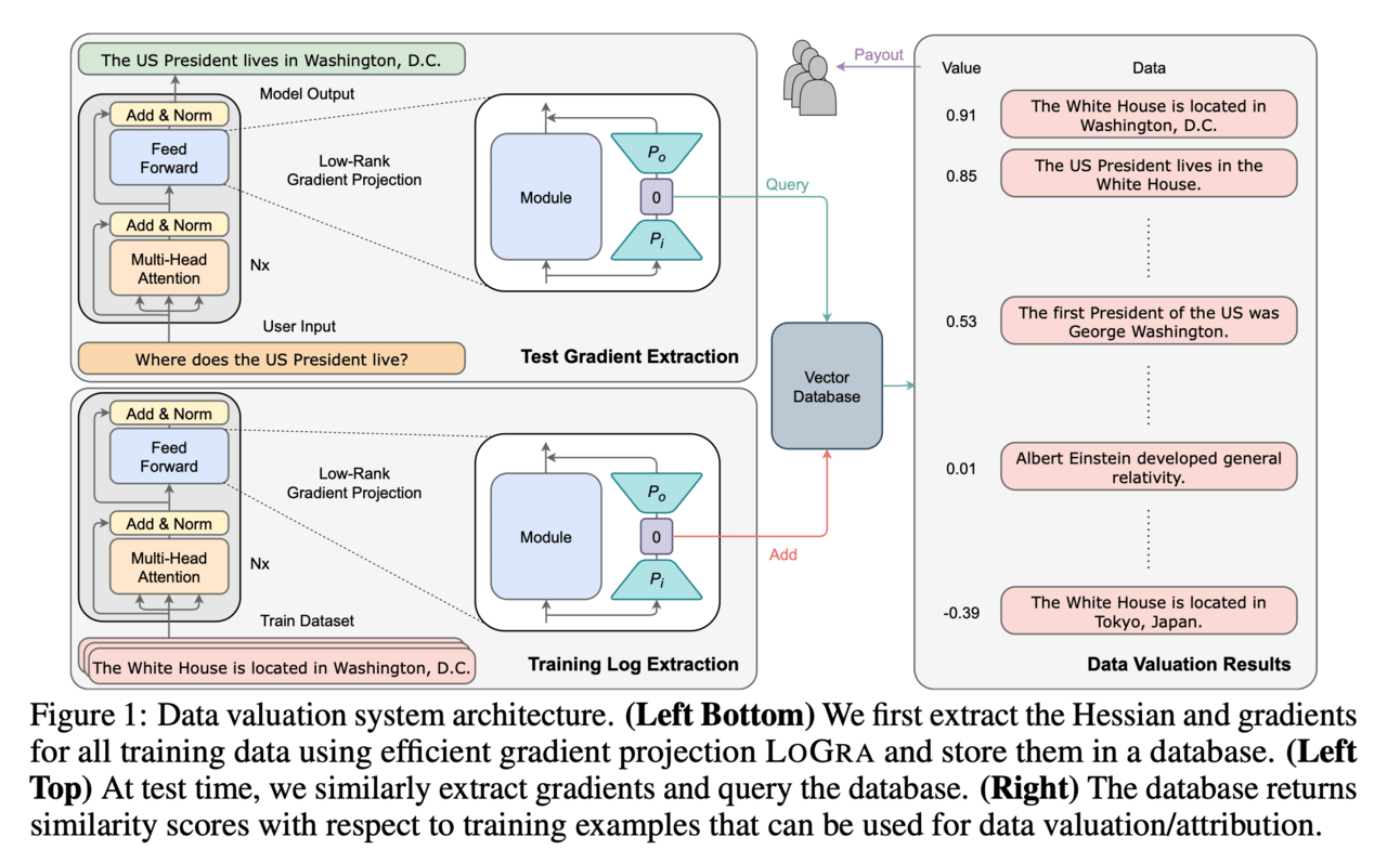💻How?: The research paper proposes a data valuation method called influence functions, which quantifies the contribution of each data to the model output. The method is improved by using an efficient gradient projection strategy called LoGra, which leverages the gradient structure in back-propagation. This approach helps to lower the compute and memory costs, making it more feasible to apply data valuation to recent LLMs and their vast training datasets.