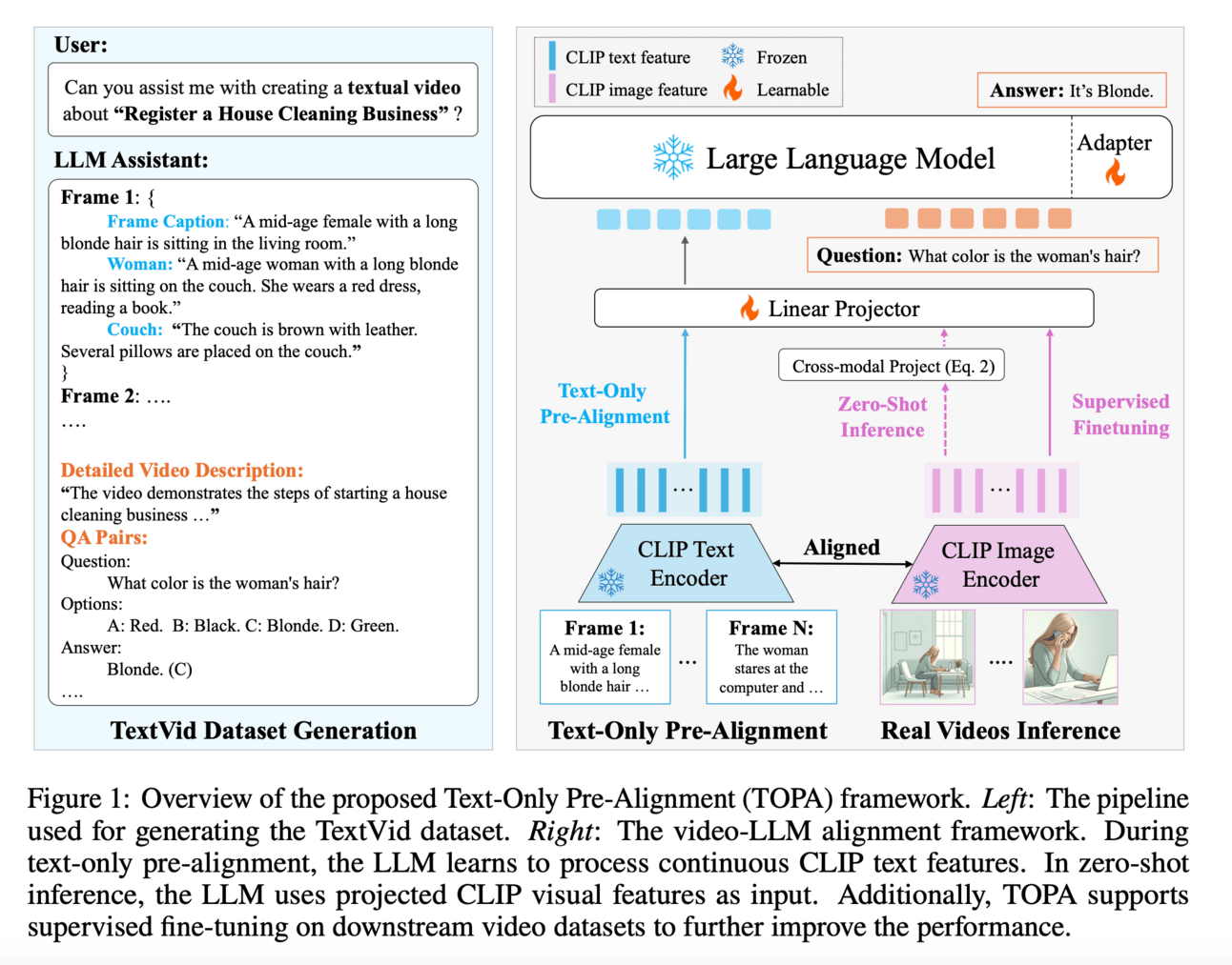 Text-Only Pre-Alignment (TOPA) extends LLMs for video understanding. This approach automatically generates textual videos using an advanced LLM, which are then used to pre-align a language-only LLM with the video modality. This is achieved by using the CLIP model as a feature extractor to align image and text modalities. TOPA bridges the gap between textual and real videos, thus improving the efficiency and effectiveness of LLMs for video understanding.