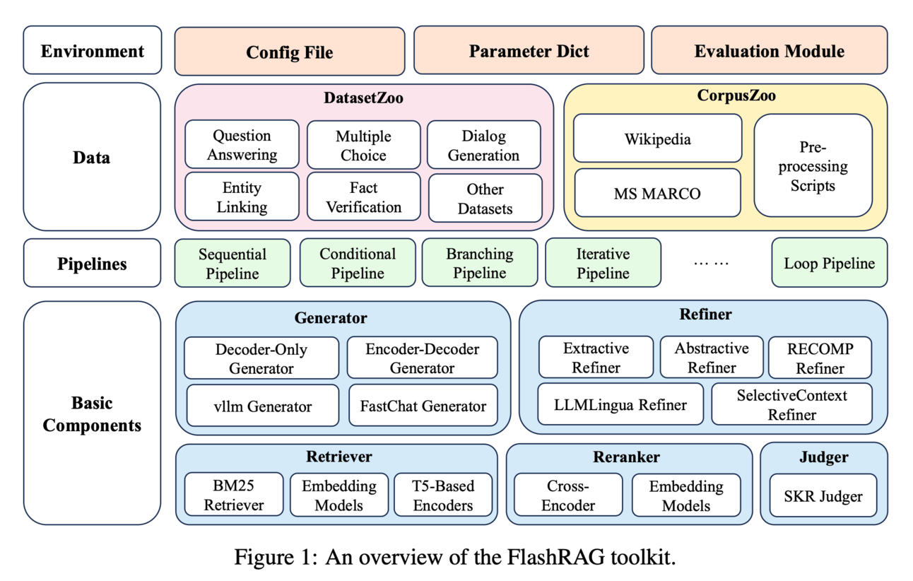 FlashRAG is an open-source toolkit that provides a customizable and modular framework for researchers to reproduce existing RAG methods and develop their own algorithms. FlashRAG also includes pre-implemented RAG works, benchmark datasets, and efficient pre-processing scripts, making it easier and more efficient for researchers to compare and evaluate different approaches.