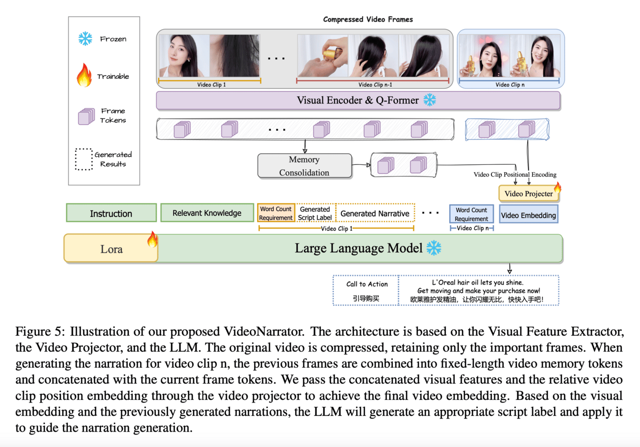 VideoNarrator framework generates a structured storyline for input videos and simultaneously generate narrations with the guidance of the generated or predefined storyline. It works by first analyzing the visual content of the video and integrating relevant knowledge to generate a structured storyline. Then, using this storyline as a guide, it generates narrations that are synchronized with the ongoing visual scenes. This approach ensures coherence and integrity in the generated narrations.