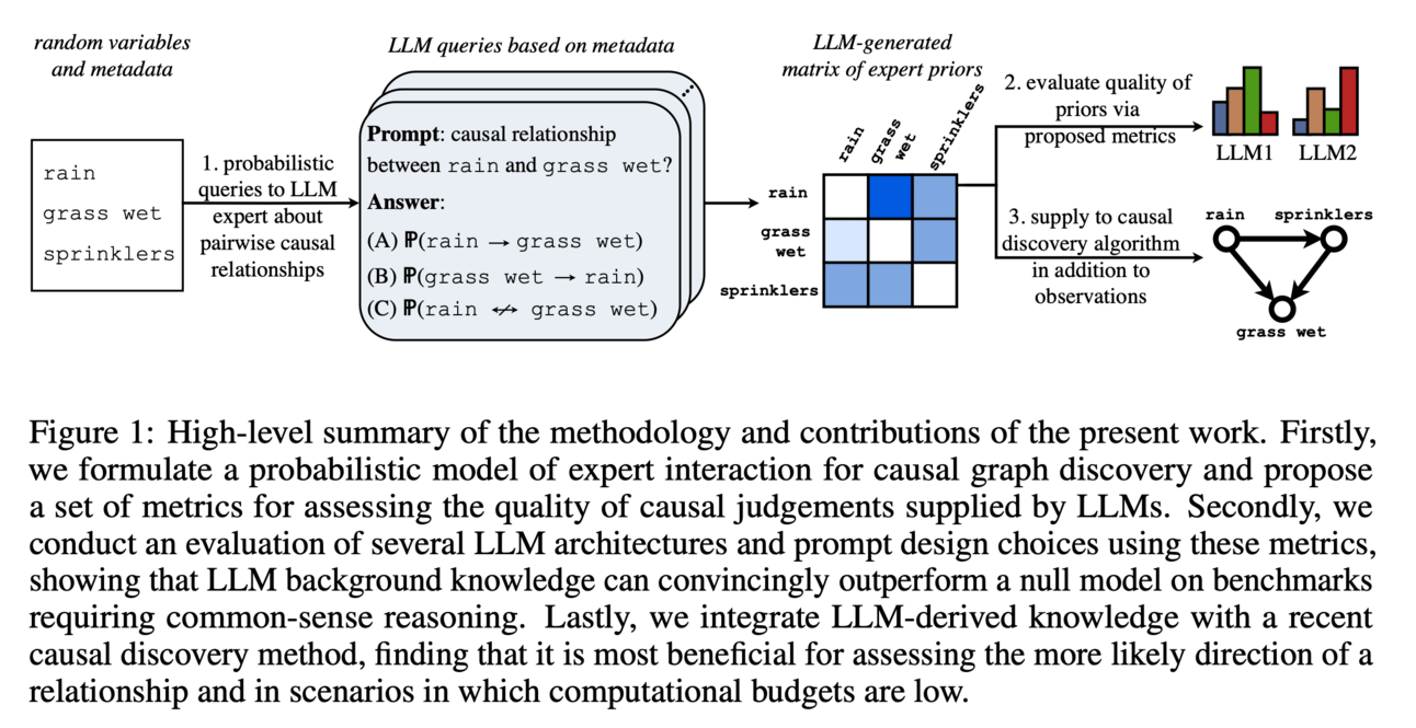 Large Language Models are Effective Priors for Causal Graph Discovery - Paper proposes a set of metrics for evaluating LLM judgments for causal graph discovery and systematically studies different prompting designs that allow the model to specify priors about the structure of the causal graph. They also present a general methodology for integrating LLM priors in graph discovery algorithms, which has shown to improve performance on common-sense benchmarks, especially in determining edge directionality.