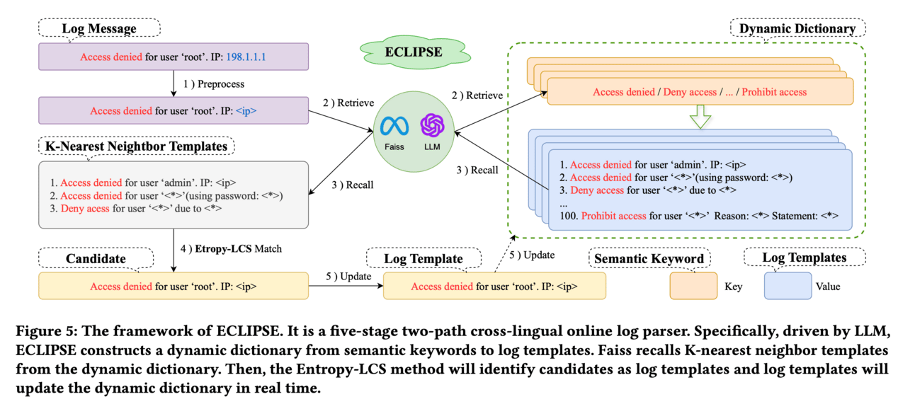 ECLIPSE (Enhanced Cross-Lingual Industrial log Parsing with Semantic Entropy-LCS), a novel approach that integrates two efficient data-driven template-matching algorithms and Faiss indexing. It also leverages the powerful semantic understanding ability of the LLM to accurately extract the semantics of log keywords and reduce the retrieval space. ECLIPSE can robustly parse industrial logs by utilizing cross-language logs with similar semantics.