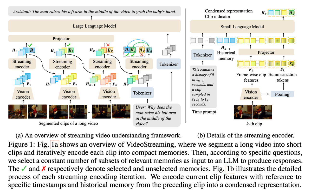 How?: The proposed VideoStreaming system addresses long video understanding through two main techniques: Memory-Propagated Streaming Encoding and Adaptive Memory Selection. Initially, long videos are segmented into manageable short clips. Each clip is then sequentially encoded while integrating a propagated memory from previously processed clips, which helps in retaining historical content relevance and reducing redundancy. This encoding process continues clip-by-clip, cumulatively updating the memory that captures essential video content elements. After encoding, the Adaptive Memory Selection mechanism comes into play, which dynamically selects a fixed number of relevant memories based on the specific questions posed about the video. This allows the system to focus only on pertinent information, thereby optimizing processing time and memory usage while ensuring that the answers generated by the LLM are contextually appropriate and detailed. This disentangled approach of video extraction and memory utilization enables the LLM to generate responses without reprocessing the entire video, allowing for efficient querying and reduced computational demands.