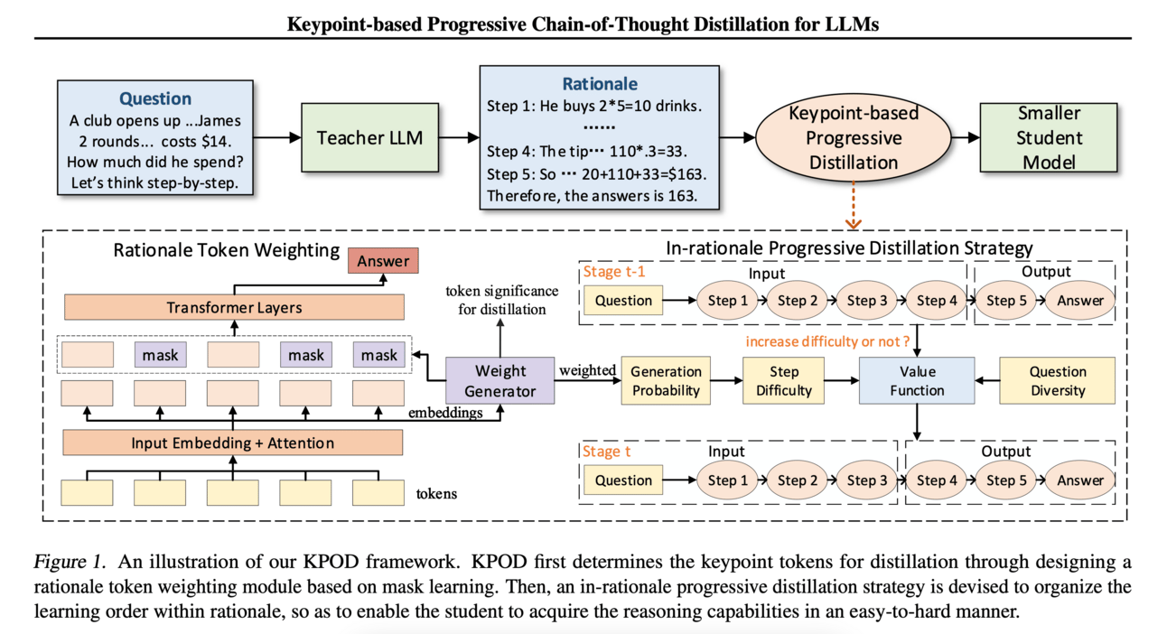 How?: The study introduces a novel framework named KPOD which focuses on two main enhancements. First, a token weighting module is developed, utilizing mask learning to prioritize and accurately replicate keystone tokens during distillation. This component helps overcome the challenge where tokens of varying importance are treated equally, which can lead to errors in logical reasoning in the student models. Second, the research proposes an 'in-rationale progressive distillation' strategy. This strategy involves initially training the smaller, student model to generate the simpler, final steps of a rationale. As training progresses, the scope expands to gradually include the entire set of reasoning steps. This mimics cognitive development by starting with easier tasks before advancing to more complex problems. To effectively implement this strategy, a weighted token generation loss is introduced to gauge the difficulty of each step in the rationale. Additionally, a value function is created to dynamically schedule the distillation process, taking into account both the difficulty of reasoning steps and the diversity of questions. The approach, unlike previous methods, aligns more closely with natural learning progressions and is designed to enhance the transfer of reasoning abilities more effectively.