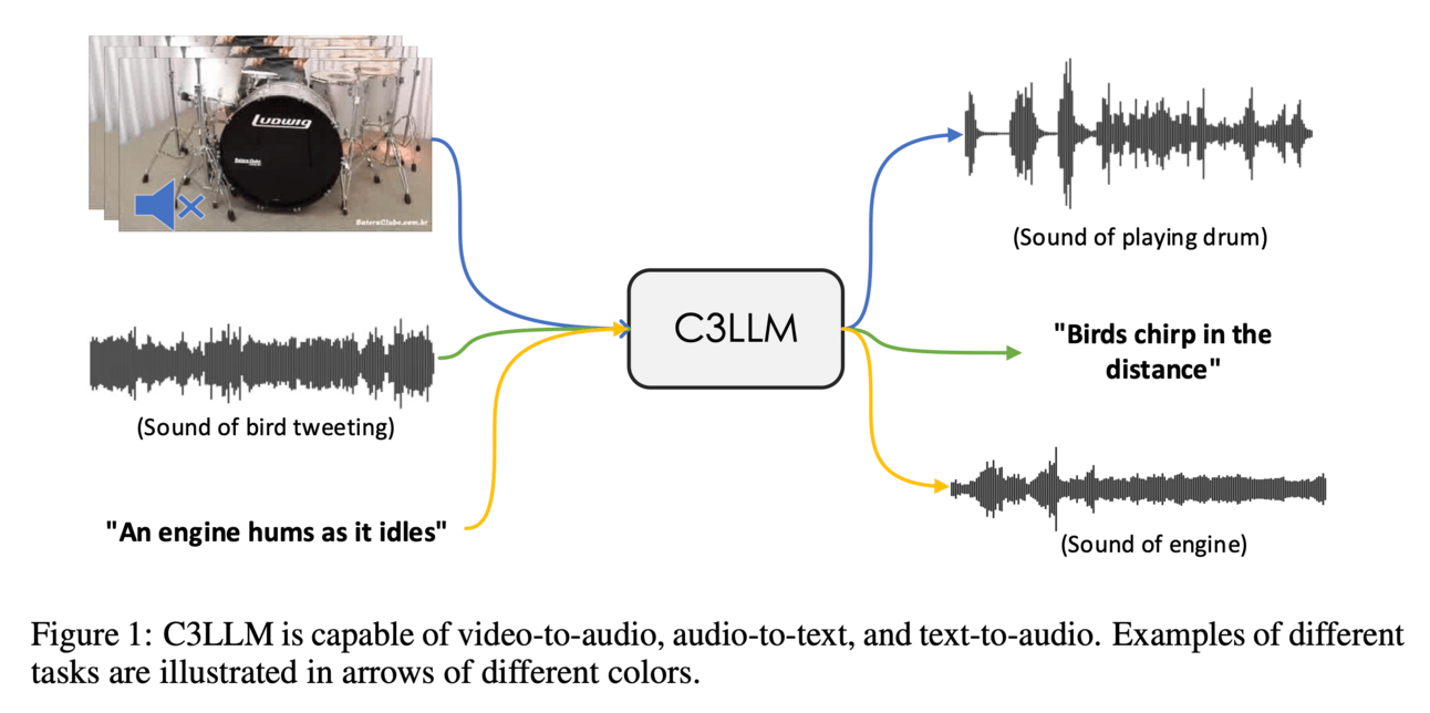 C3LLM integrates three different tasks (video-to-audio, audio-to-text, text-to-audio) with LLMs.