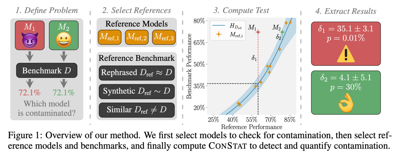 How?: Introducing a novel definition of contamination, the study defines it as performance that artificially inflates and does not generalize across different scenarios like rephrased samples, synthetic samples, or varied benchmarks. They developed 'ConStat', a statistical method that detects and quantifies contamination by assessing performance discrepancies between a primary and a reference benchmark relative to a set of reference models.
