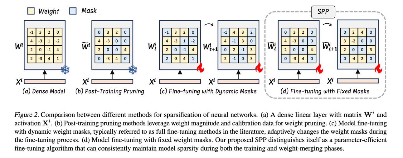 How?: The paper introduces SPP, a Sparsity-Preserved Parameter-efficient fine-tuning method that uses lightweight learnable column and row matrices. This method optimizes sparse LLM weights by maintaining the structural and sparsity integrity of pruned models through element-wise multiplication and residual addition. This allows the models to retain their sparsity patterns and ratios throughout training and merging processes. The effectiveness of SPP was demonstrated on the LLaMA and LLaMA-2 model families using various sparsity patterns (unstructured and N:M), particularly focusing on high sparsity ratios like 75%.