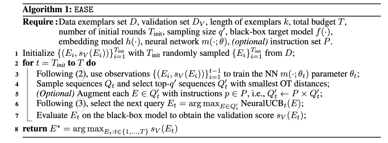 How?: The study introduces a novel method named EASE that uses hidden embeddings from a pre-trained language model to represent ordered sets of exemplars. EASE employs a neural bandit algorithm to dynamically optimize the selection and sequencing of exemplars based on their potential impact on task performance. It considers the often overlooked influence of exemplar order within the prompt and enables efficient selection of optimal exemplar sets for all test instances of a task, thus eliminating extra computational needs during test-time. Additionally, the method is designed to concurrently optimize both the exemplars and the instructions in the prompt.